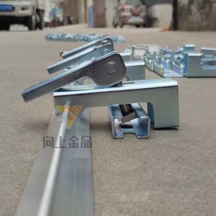 3、手动旋转压紧手柄,适当时向上(下)推到底,可对角铝施加足够的压力,保持裙板位置,且压紧手柄不会松动脱落。